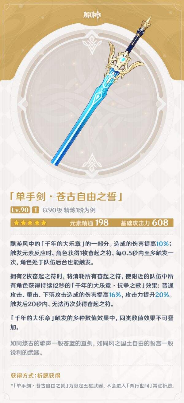 既然上面提到了一种邪道玩法,就接着来提及另外一把五星武器,苍古自由之誓。