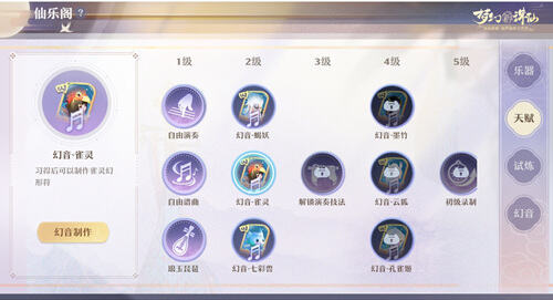 演奏也会带来一些奇妙的能力,「幻音:天赋」中包含多种幻音类天赋,解锁后可制作对应幻形卡,解锁高级天赋后,制作的幻形符还将附带额外属性。学习弹奏乐曲,为修仙之途带来更多乐趣!