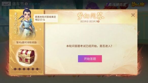 梦幻问答现在开始,快来为你的王牌知识“查漏补缺”吧!9月2日9月29日期间,梦幻问答活动将于每周六、周日开放,活动时间内每日0点、12点、17点、21点都将刷新一轮问答,每轮问答共有十道速度节知识小问答,答对其中6题即可领取宝箱。如此千载难逢的机会,车手们可千万别错过哦。